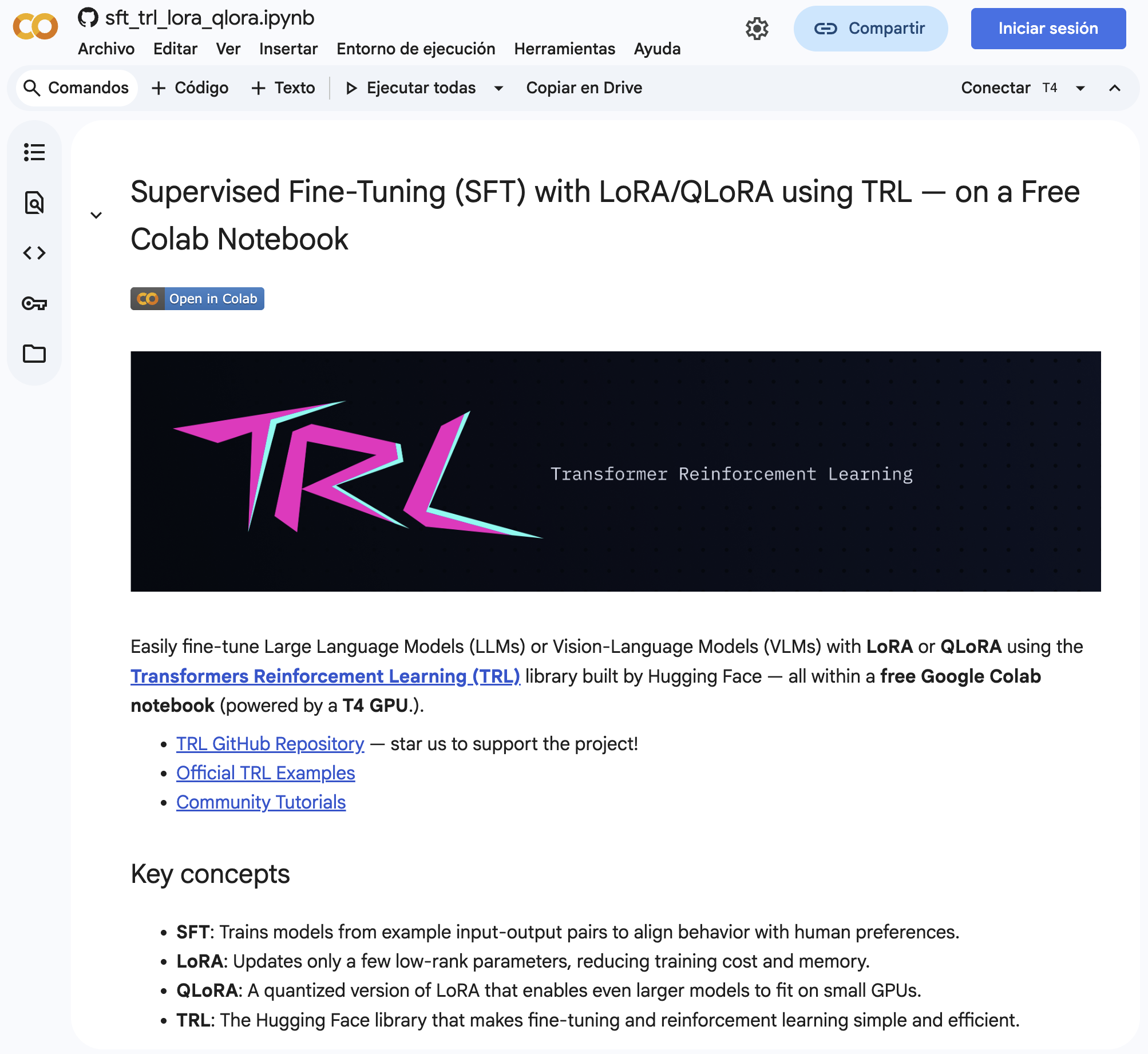 colab: https://colab.research.google.com/github/huggingface/trl/blob/main/examples/notebooks/sft_trl_lora_qlora.ipynb