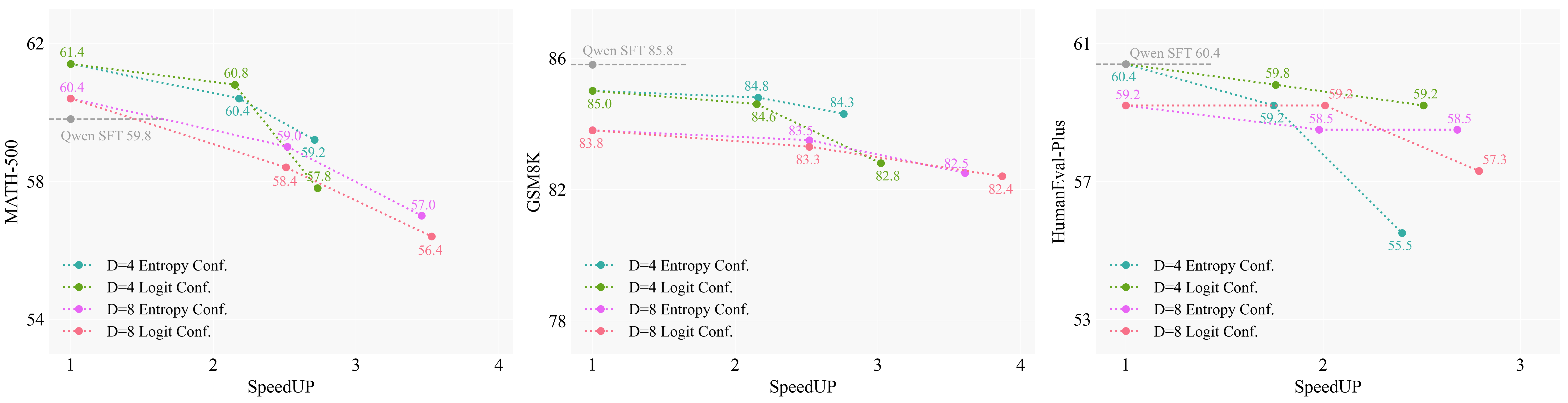 Trade-off between performance and speed under different confidence thresholds Ï„ for SDLM-3B (B=4) and SDLM-3B (B=8). By adjusting Ï„, a controllable trade-off between speed and performance can be achieved. SpeedUp denotes the average number of tokens output per forward pass.