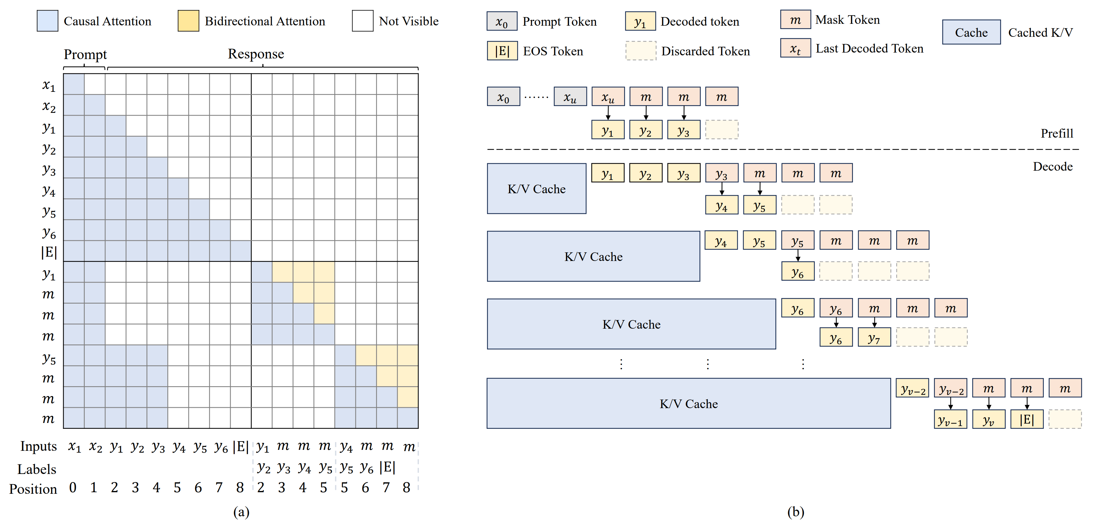 - (b) Sampling Pipeline. Confidence-based dynamic block decoding with KV cache reuse. At each step, a block of B tokens is predicted with B-1 padding masks. The longest high-confidence prefix is selected as dynamic output. Cached KV states enable efficient decoding.