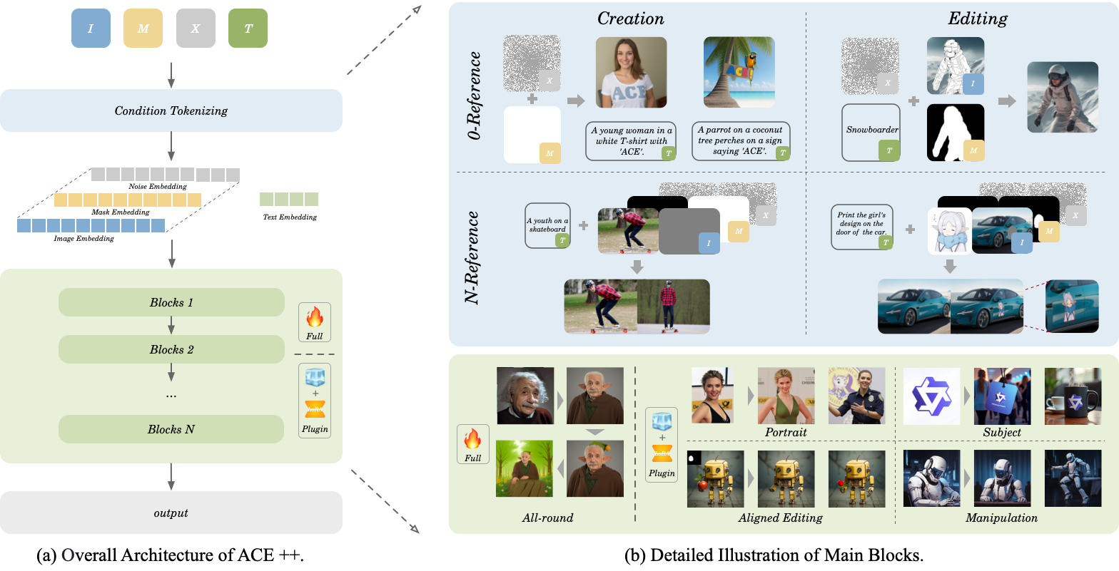 Fully finetuning a composite model with ACE’s data to support various editing and reference generation tasks through an instructive approach.