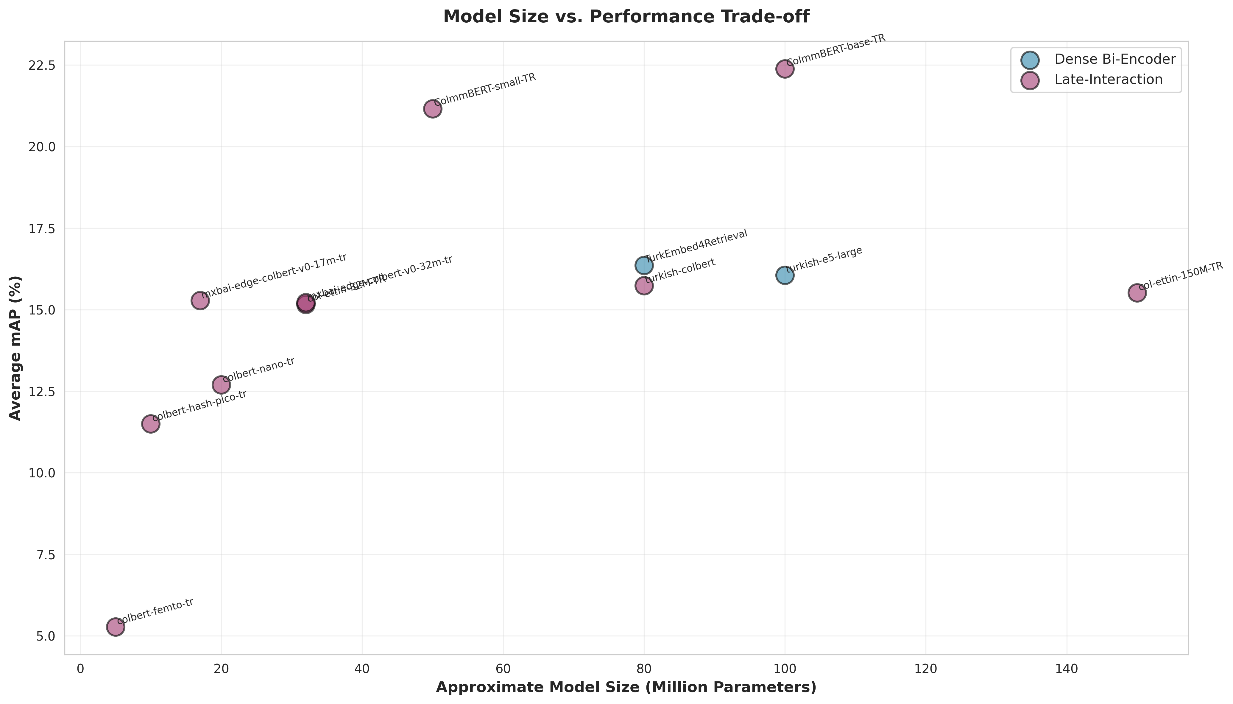 These results collectively suggest that for Turkish IR systems prioritizing retrieval quality, late-interaction architectures should be the default choice, with model size selected based on available computational resources and latency requirements.