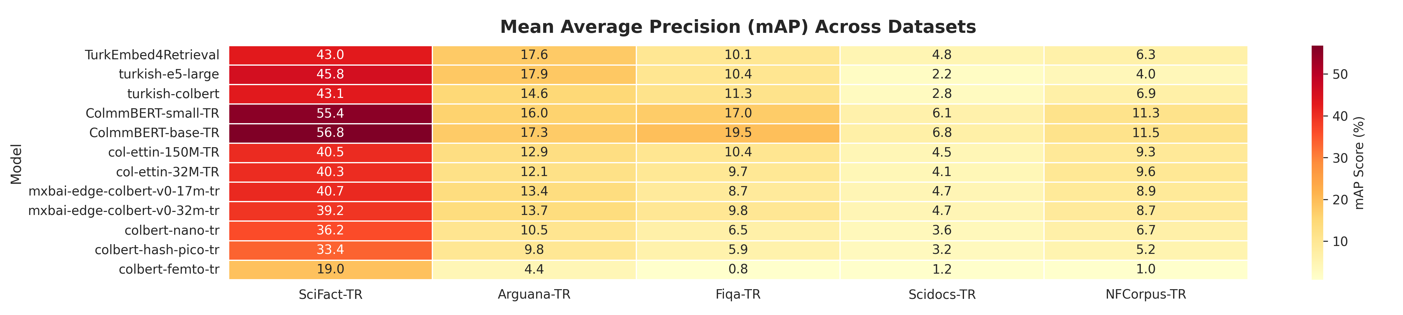Our comprehensive evaluation across five Turkish BEIR datasets reveals several critical insights about the performance characteristics of different retrieval architectures. The results demonstrate that late-interaction models consistently outperform dense bi-encoders across nearly all benchmarks, with ColumBERT-base-TR achieving the highest mean Average Precision (mAP) on four out of five datasets. Remarkably, ColumBERT-small-TR, with only 140M parameters, matches or closely approaches the performance of its 310M-parameter sibling while offering substantially faster inference times and reduced memory footprint.