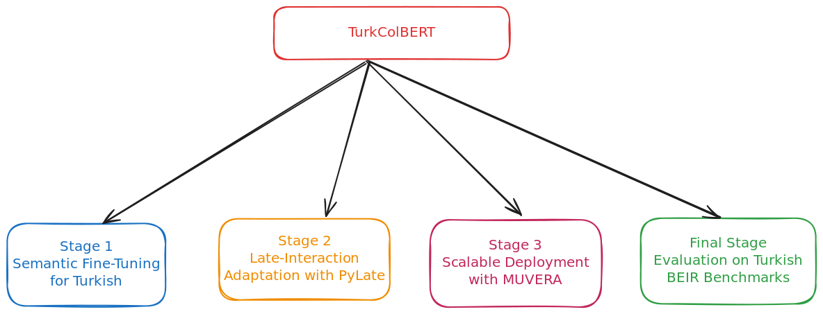 - We adapt multilingual and English encoders to Turkish with a semantic fine-tuning stage (NLI + STS), then turn them into ColBERT-style retrievers using PyLate and MS MARCO-TR.