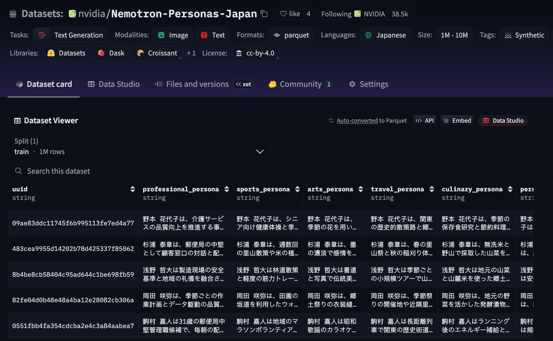 NVIDIA のエンタープライズ向け合成データ生成システム、NeMo Data Designer を用いて作成されたNemotron-Personas-Japan は、すでに広く利用されている US Personas データセットの成功を機に日本版として開発されました。本リリースは、各国・地域におけるソブリン AI 開発を支援する合成ペルソナデータセットとデータ構築方法のグローバルコレクションの第一弾です。