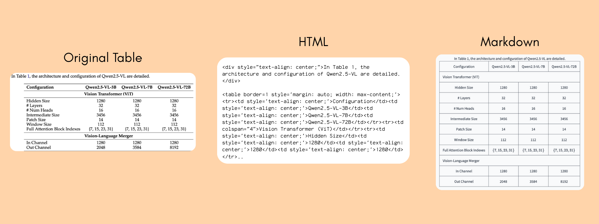 | DeepSeek-OCR | Markdown, HTML | Supports general visual understanding Can parse and re-render all charts, tables, and more into HTML Handles handwriting Memory-efficient, solves text through image |