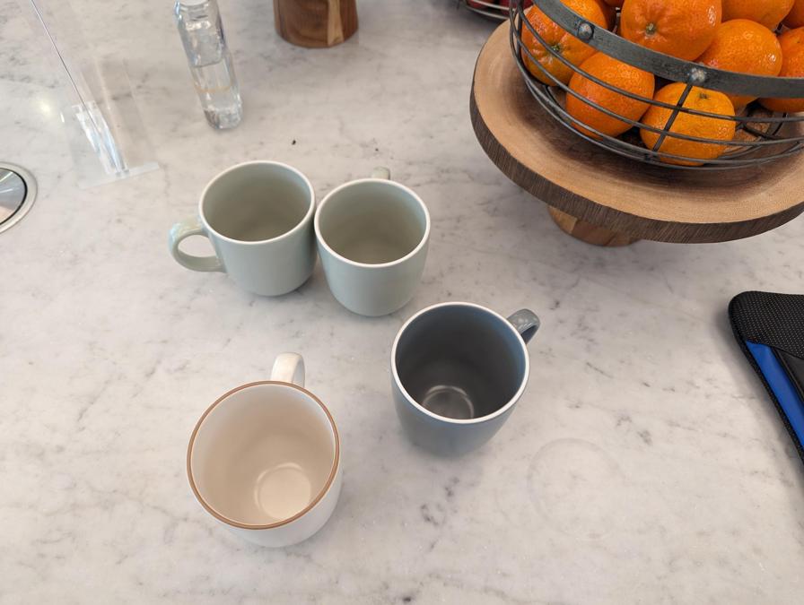A top-down view of a white marble counter with four coffee mugs on it. There are two gray ones on the left, and one is white on the bottom left. The one on the right is gray. There is a metal wire fruit basket on a wood stand in the top right corner with oranges in it. There is a clear glass pitcher with water in it on the left, and part |