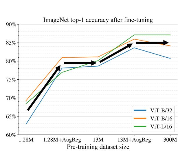 A line graph shows the top-1 accuracy of the ImageNet model after fine-tuning. The graph shows four lines that are colored blue, orange, green, and black. The blue line is the lowest of the four lines, and it is |