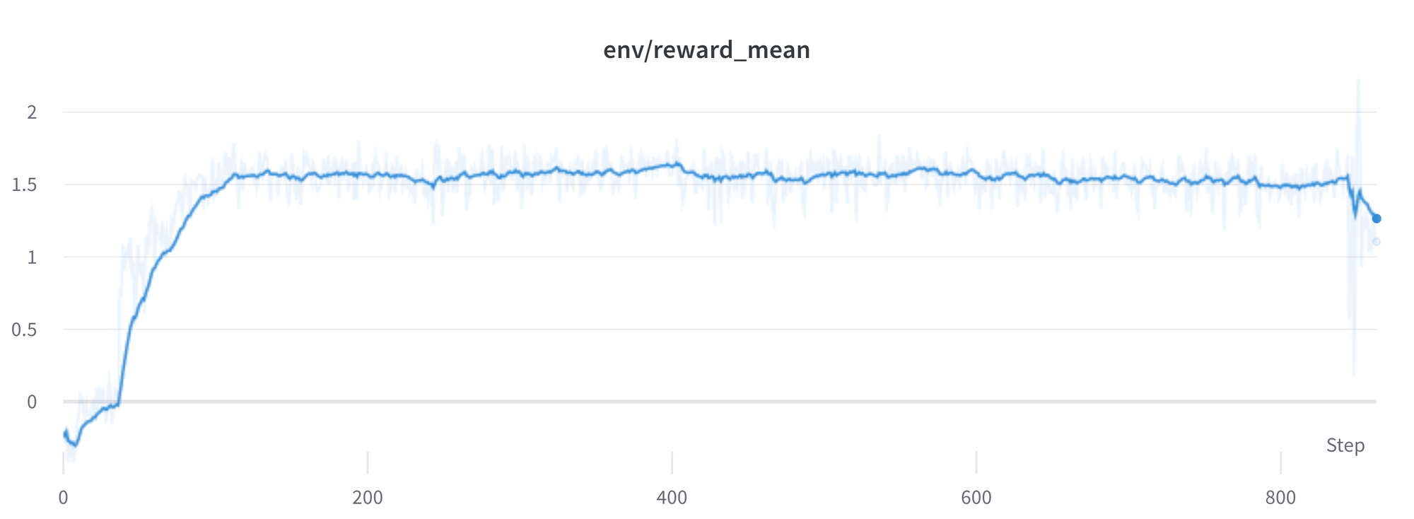 Per batch reward at each step during training. The model’s performance plateaus after around 1000 steps.