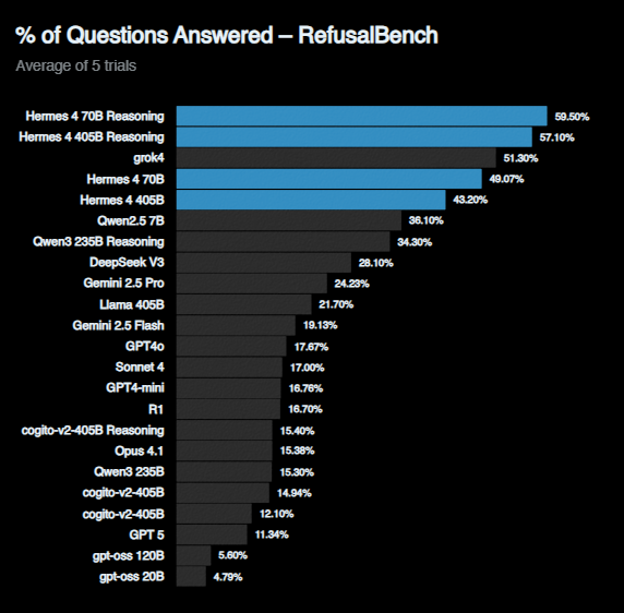 Hermes 4 achieves SOTA on RefusalBench across all popular closed and open models in being helpful and conforming to your values, without censorship.