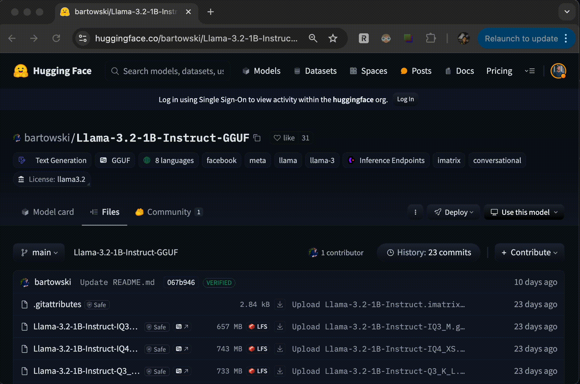 ollamafromUse this modeldropdown. For example: bartowski/Llama-3.2-1B-Instruct-GGUF.