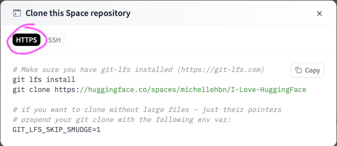 Select “Clone repository”, and then you’ll be able to follow the instructions to clone the Space repo to your local machine using HTTPS or SSH.