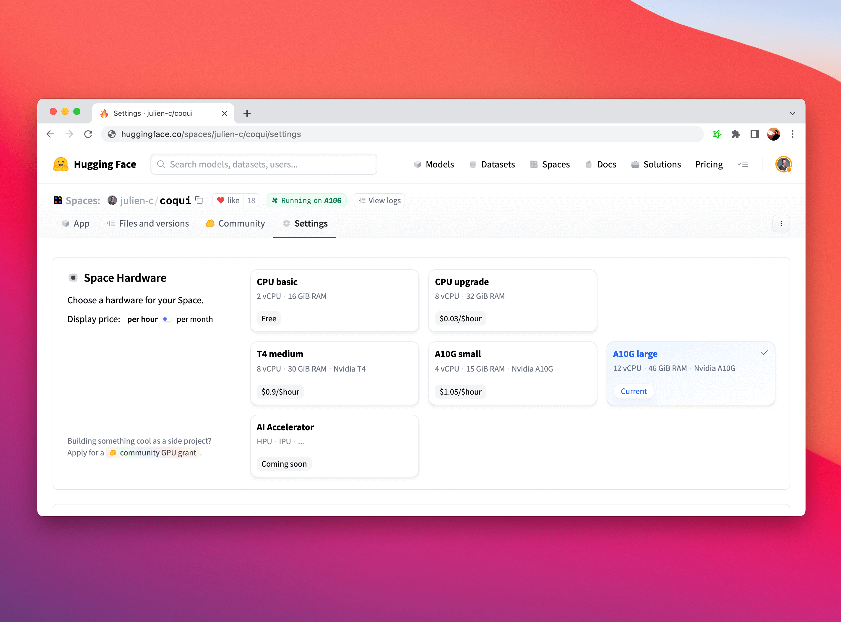 Do you have an awesome Space but need help covering the hardware upgrade costs? We love helping out those with an innovative Space so please feel free to apply for a community GPU grant using the link in the Settings tab of your Space and see if yours makes the cut!