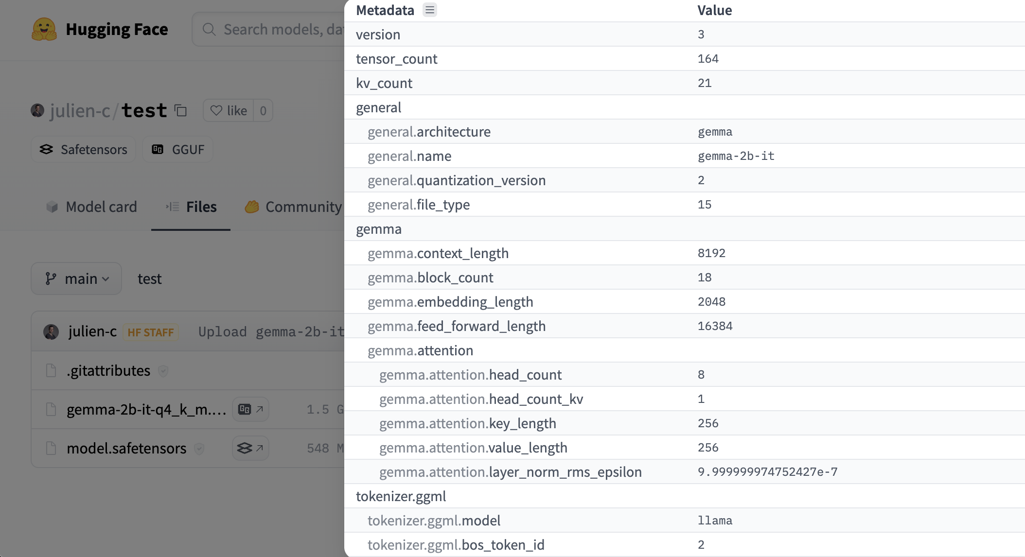 The Hub has a viewer for GGUF files that lets a user check out metadata & tensors info (name, shape, precision). The viewer is available on model page (example) & files page (example).