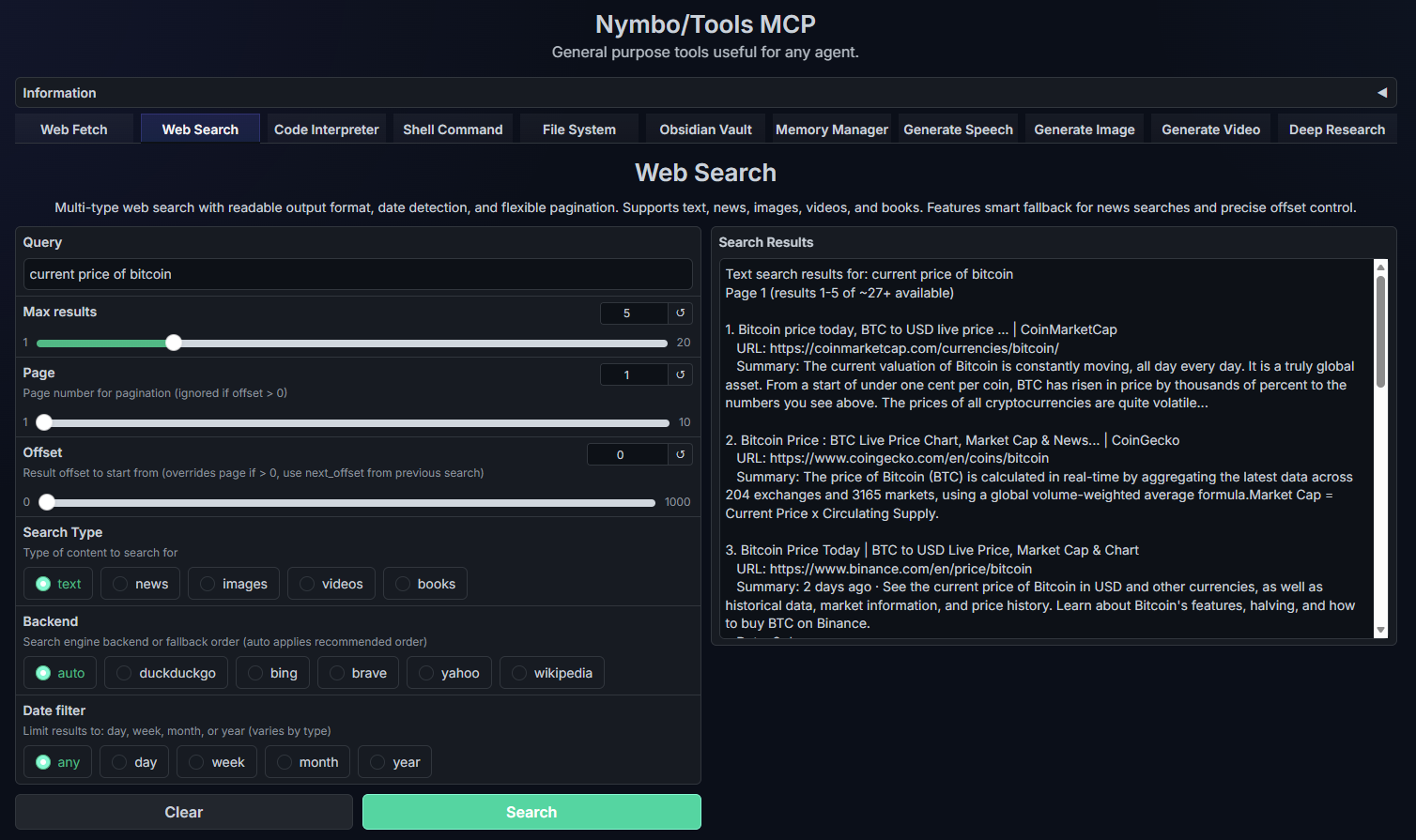 Obsidian_Vault. I'd argue it's far more context-efficient than any other Obsidian MCP I've seen, and doesn't require any plugins. Also some big improvements to the Web_Search and Web_Fetch tools.File_System tool, but it works so well for navigating Obsidian without unnecessary context. It supports recursive (full-text) search across the entire vault, and supports offset so the agent can "scroll" through a document without re-consuming tokens.OBSIDIAN_VAULT_ROOT environment variable to your vault's root path. If you don't use Obsidian, this is perfectly usable as simply a read-only filesystem.Web_Search tool previously just used DuckDuckGo as a backend search engine, but now it also supports Bing, Brave, Yahoo, and Wikipedia. Default engine is auto which provides results from all backends in recommended order. Still doesn't require any kind of API or auth for Web_Search.off by default :)Web_Fetch tool that basically executes a cURL request on the URL, returning the full HTML page if necessary.File_System and Shell_Command tools. Using Claude Skills doesn't currently work in the public HF space because of environment restrictions, but using Skills works perfectly well running locally.File_System and Shell_Exec. You can theoretically do basically anything with these two tools, and it should enable support for many Claude Skills. Filesystem, that's the agent's "root". It can perform the following actions : list, read, write, append, mkdir, move, copy, delete, info, help. It's able to keep this all within the scope of one tool call by making the Action field required and all other fields optional. Using a filesystem shouldn't require 15 different tools.File_System and Shell_Exec tools aren't super polished yet, I'll continue to improve the agent's instructions and UX of using the new tools. Most of my testing was done with gpt-oss-20b and if it messes up, it gets the gist after one failed tool call. It should work perfectly fine for the GPU poor.