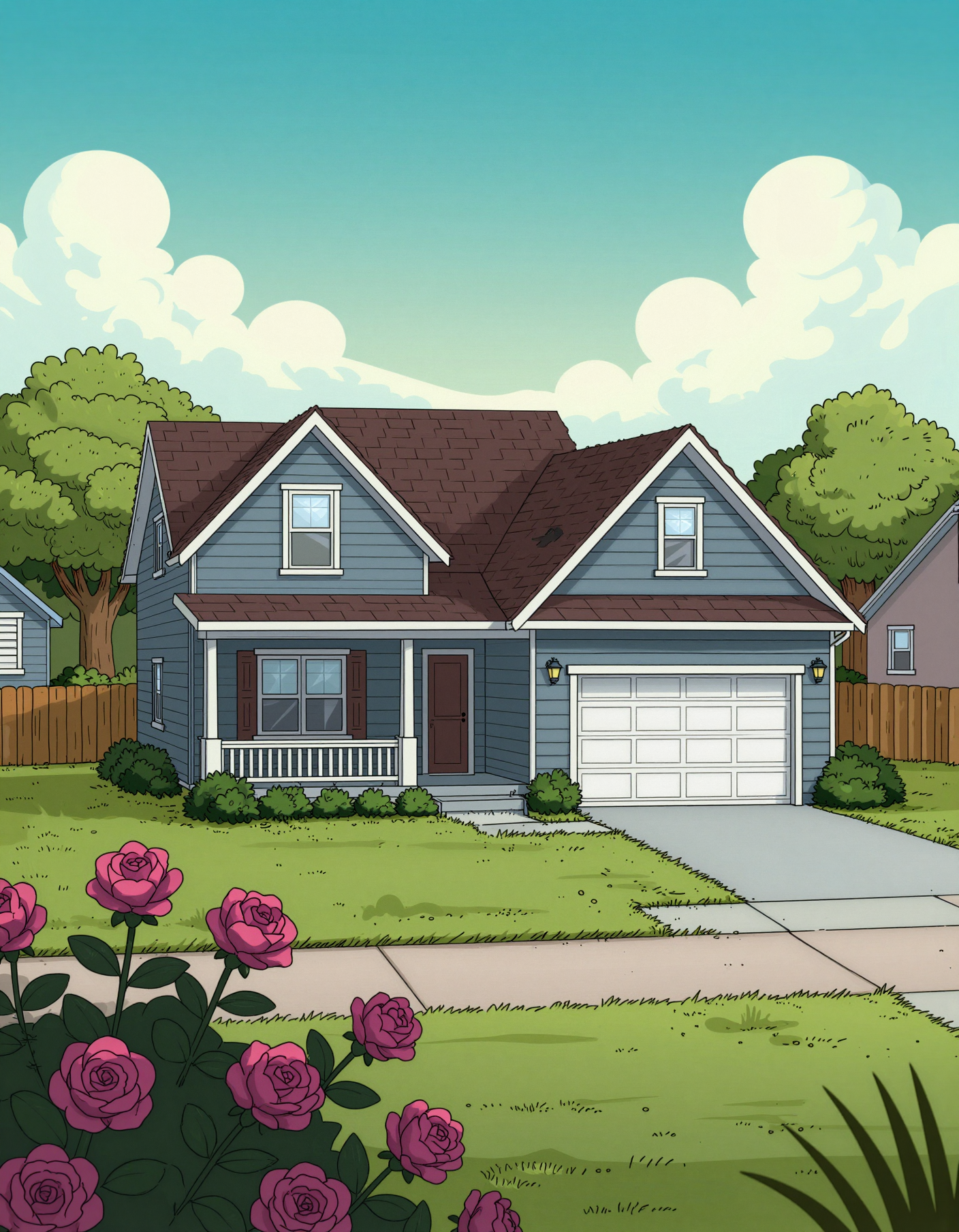 suburbansaturd4ym0rning A digital cartoon illustration depicts a suburban house with a blue-gray exterior and a brown shingled roof, surrounded by lush greenery and pink roses in the foreground. The house features a front porch with a lantern, a garage, and a small lawn. The sky is a gradient from teal to light blue, with fluffy white clouds. A wooden fence and other houses are visible in the background.