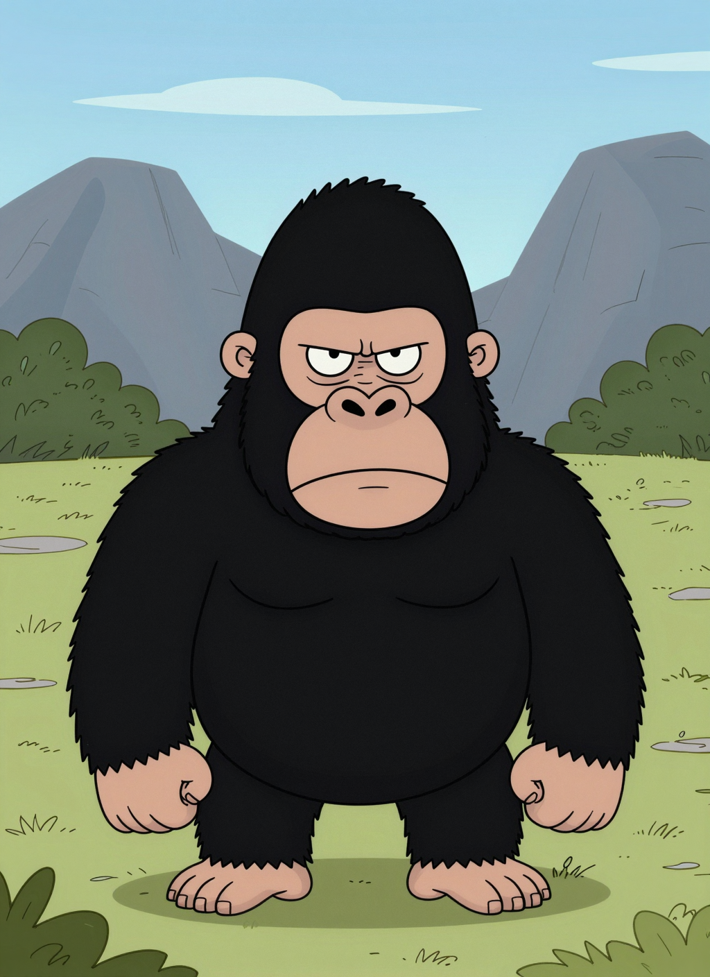 saturd4ym0rning A cartoon gorilla with a serious expression, wearing a black outfit, stands with clenched fists in a grassy field with mountains and bushes in the background. The sky is blue.