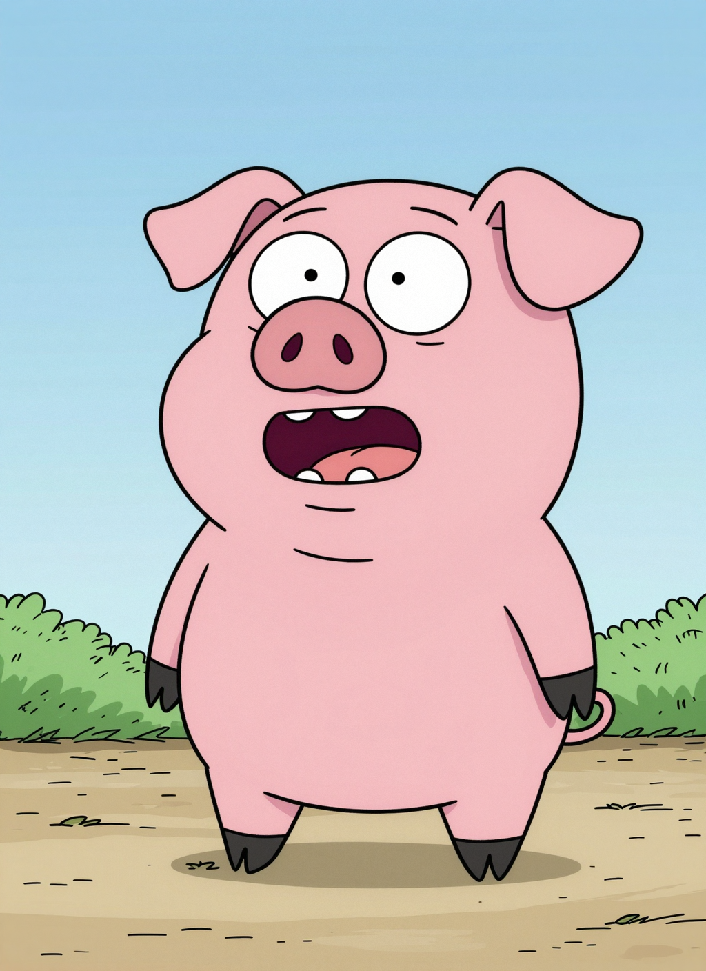saturd4ym0rning This is a digital cartoon drawing of a chubby, pink pig standing on a dirt path. The pig has large, expressive eyes, a wide open mouth revealing small teeth, and a curly tail. The background features a simple, light blue sky with green bushes at the bottom. The style is reminiscent of classic, humorous cartoons.