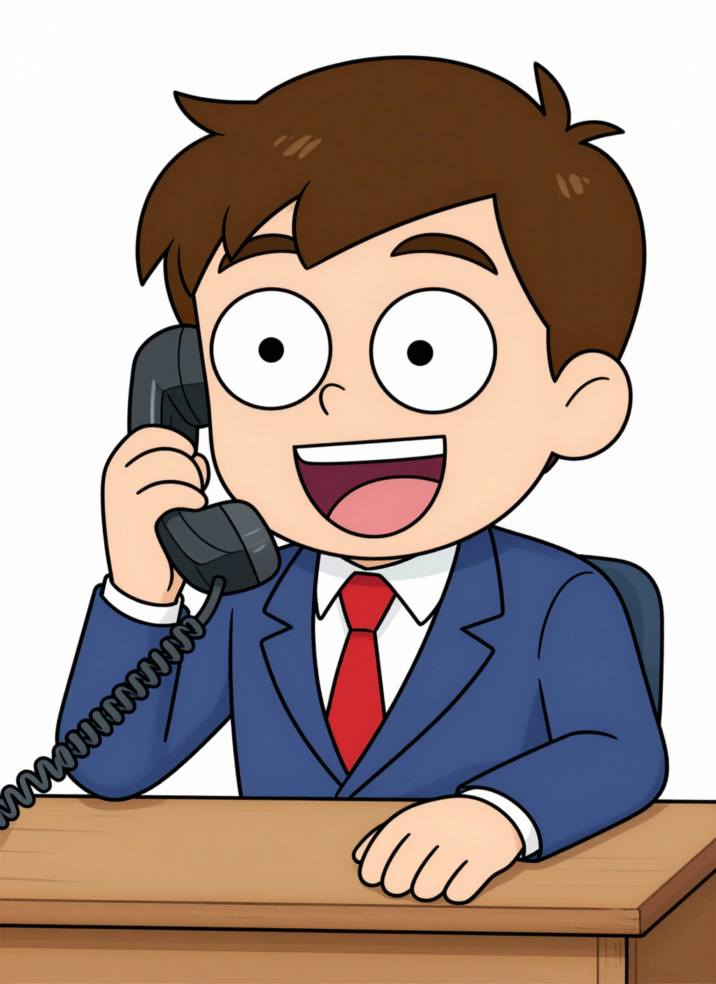 A cartoon-style drawing features a young man with brown hair, large round eyes, and a wide, excited smile. He is wearing a blue suit with a white shirt and red tie. He is seated at a wooden desk, holding a black telephone to his ear with his right hand, while his left hand rests on the desk. The background is plain white, making the character the focal point.