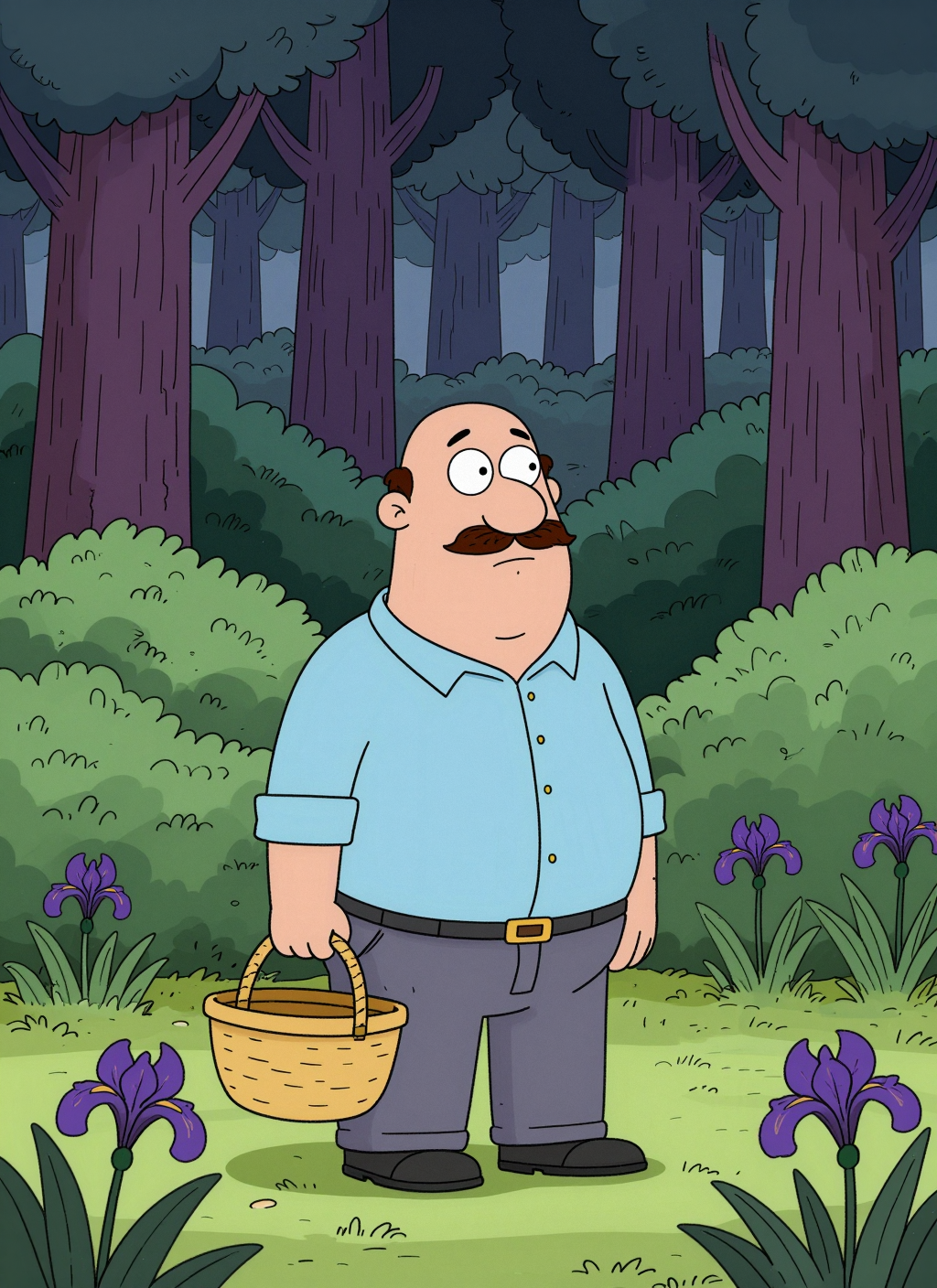 cartoon drawing of a plump, middle-aged man with a bald head and a mustache, wearing a light blue button-up shirt and gray pants, holding a yellow basket. He stands in a lush, green forest with tall, purple trees, surrounded by bushes and purple irises. The man's expression is neutral, and the background is detailed with varying shades of green and purple, creating a tranquil, forested setting.
