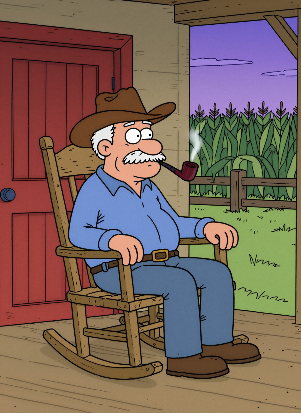 saturd4ym0rning A cartoon drawing depicts an old man with white hair and a mustache, wooden rocking chair on the porch of a cabin. He wears a brown cowboy hat, a blue shirt, and jeans, smoking a pipe. The background shows a red door, a fence, and cornfields under a purple twilight sky. The art style is simple with bold lines and flat colors.