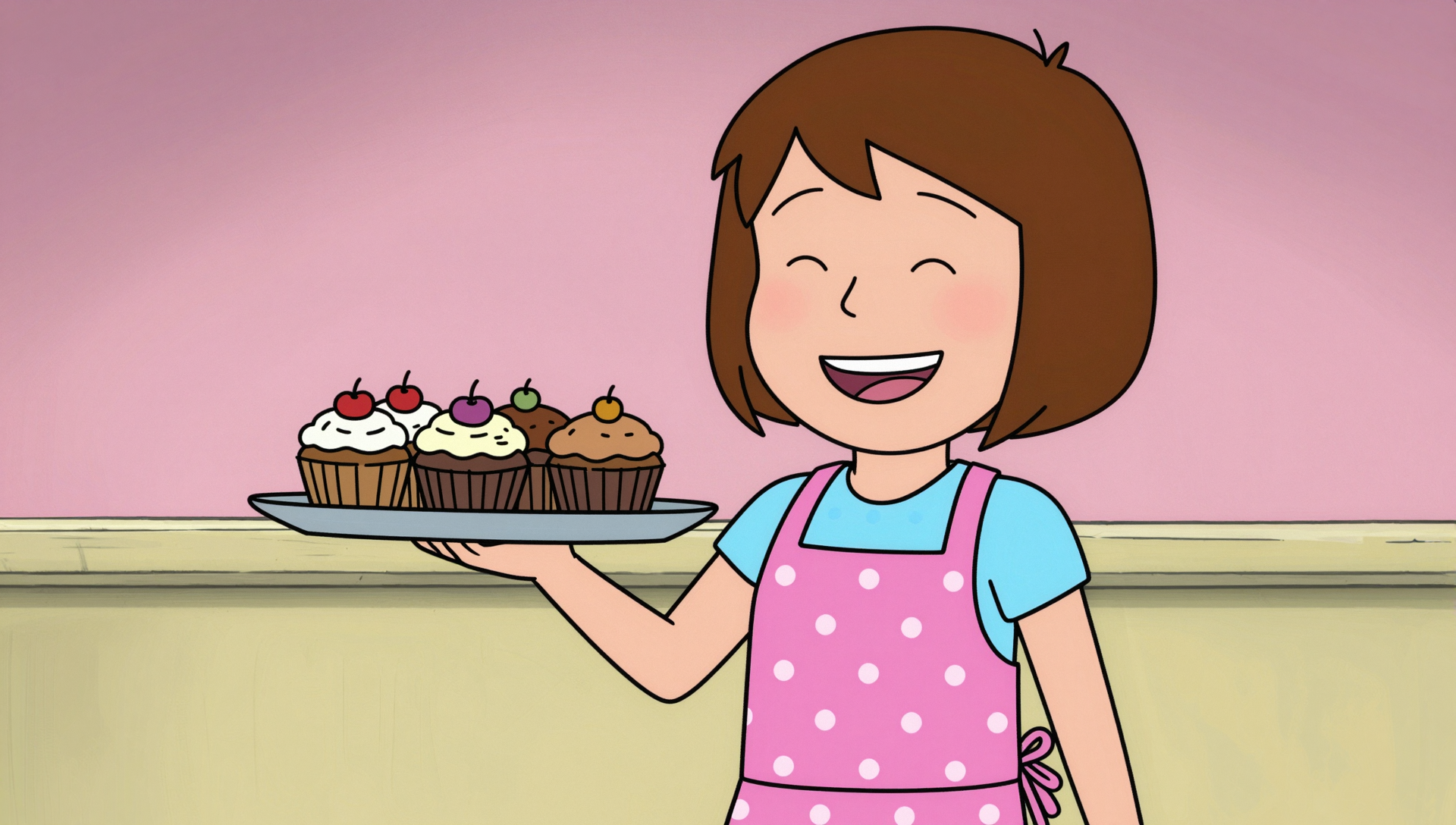 A cartoon drawing of a woman with short brown hair and a pink polka-dot apron, smiling, holding a tray of cupcakes. She stands in front of a pink wall with a yellow baseboard.
