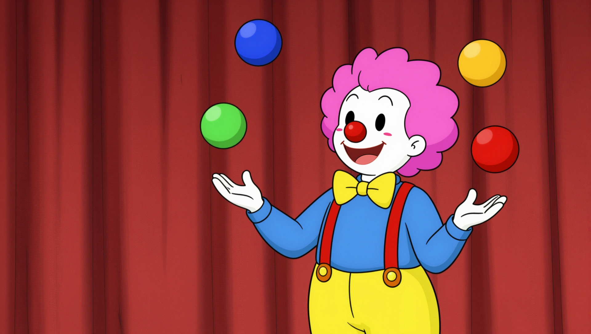 saturd4ym0rning A cartoon clown with a white face, pink hair, and a red nose stands against a red curtain backdrop, juggling five colorful balls. The clown wears a yellow bowtie, red suspenders, blue shirt sleeves, and yellow pants. The scene has a simplistic, flat-shaded art style. Both palms facing upward as if to catch the balls. 3/4 angle view for a sense of depth