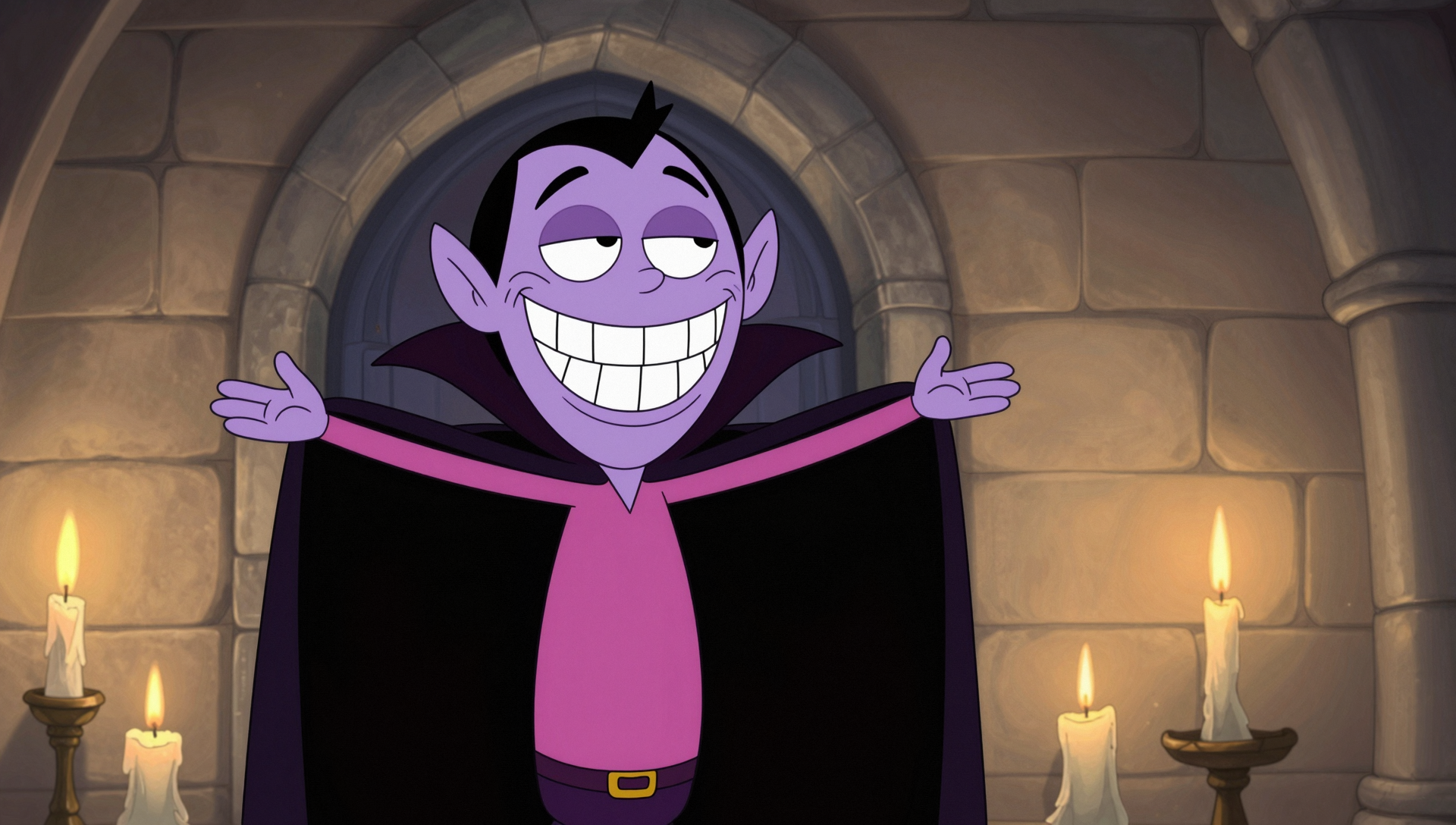 saturd4ym0rning A cartoon character with a wide, vampire theme color, toothy grin and black hair stands in a stone-walled room with lit candles. The character has pale purple skin and is wearing a pink shirt, arms outstretched holding up a cape like a vampire. The background features an arched stone doorway and several lit candles on either side. The style is reminiscent of american toon styles. Half lidded eyes sleepy