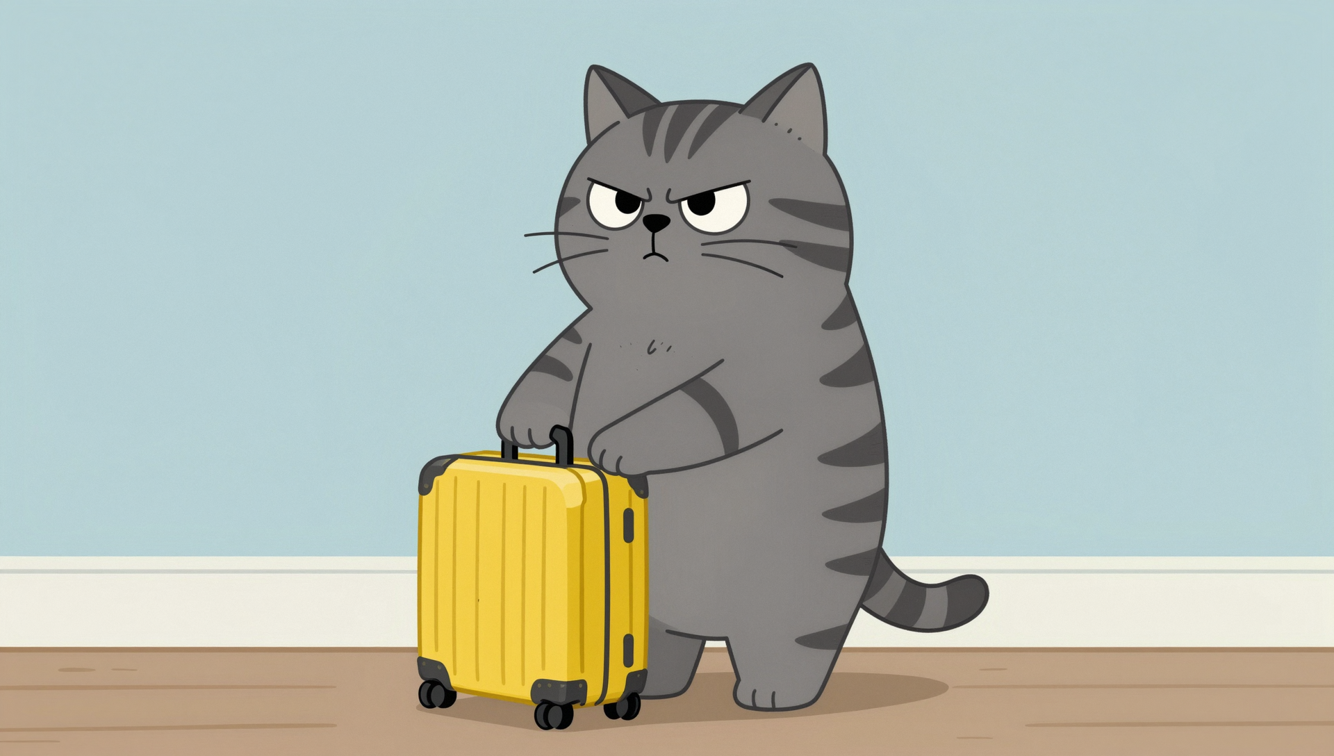 saturd4ym0rning side-profile 3/4 action motion shot grey, chubby mad cat with black stripes and wide, round eyes, standing upright. The cat has a small nose and stands holding a yellow suitcase in his hands. The background features a pale blue wall and a white baseboard. The scene is simple and minimalistic, with flat colors. The cat has a miffed angry scowl expression, and the overall atmosphere is calm and uneventful.