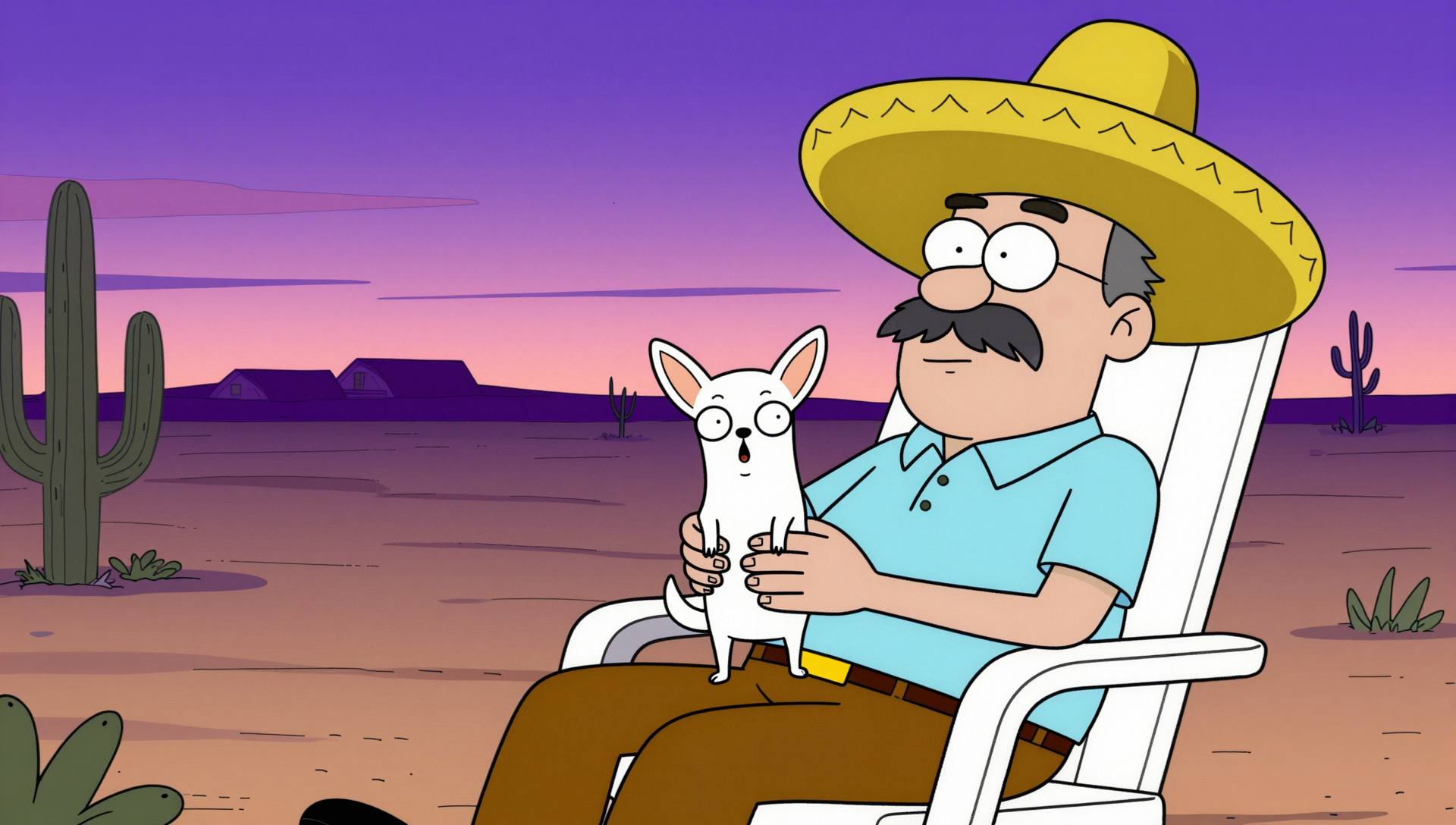 saturd4ym0rning cartoon featuring an older man with a mustache, wearing a yellow sombrero and a light blue shirt, seated on a white plastic lawn chair. He is holding a small white chihuahua dog that has a surprised expression. The background shows a desert landscape at sunset with purple and pink skies, cacti, and distant buildings. The overall tone is playful and whimsical.