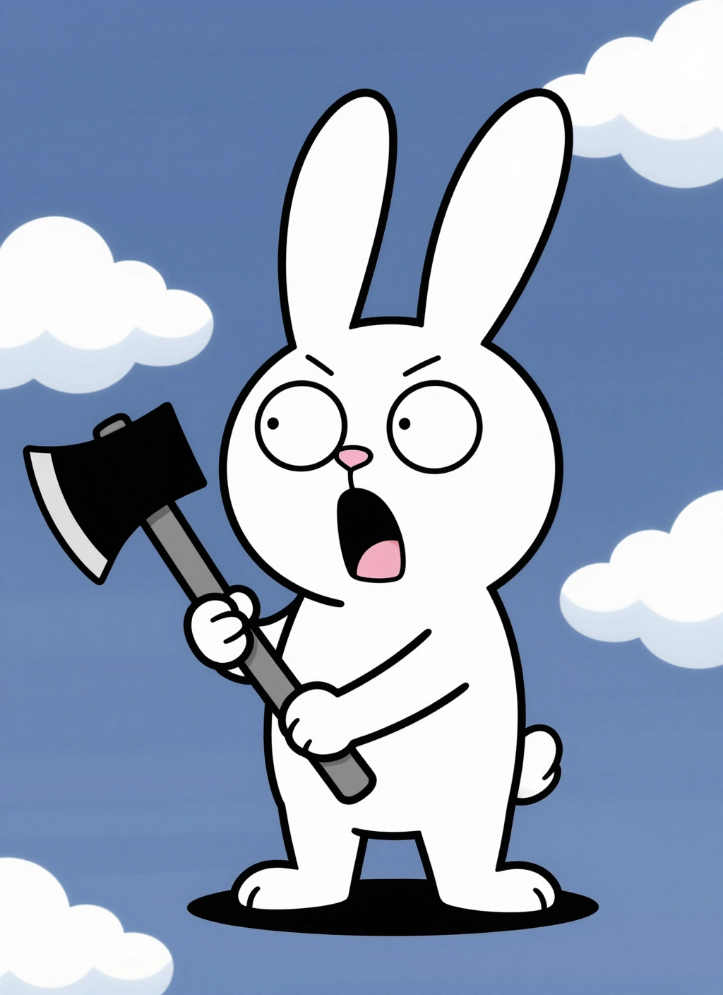 saturd4ym0rning A black-and-white digital drawing of an anthropomorphic mischevious evil white rabbit holding an axe with large, round eyes, pink nose, and a wide-open mouth expressing surprise. The rabbit has long ears, a small tail, and stands upright on two legs with arms by its sides. The background is clouds on a blue background, emphasizing the character's simple, cartoonish design.