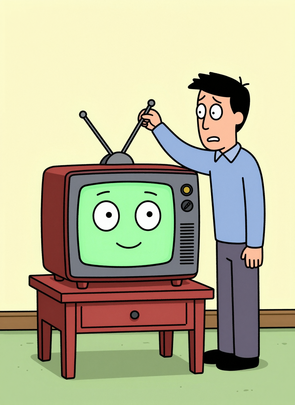 saturd4ym0rning A cartoon-style drawing depicts an old-fashioned TV with a green screen and a simple face, featuring wide eyes and a smiling mouth. The TV sits on a small, red wooden table with a central drawer. Two antennae extend from the top of the TV. The background shows a plain, light yellow wall with a brown baseboard. The floor is green. a man is stsanding beside the tv adjusting the antenna in frustration.