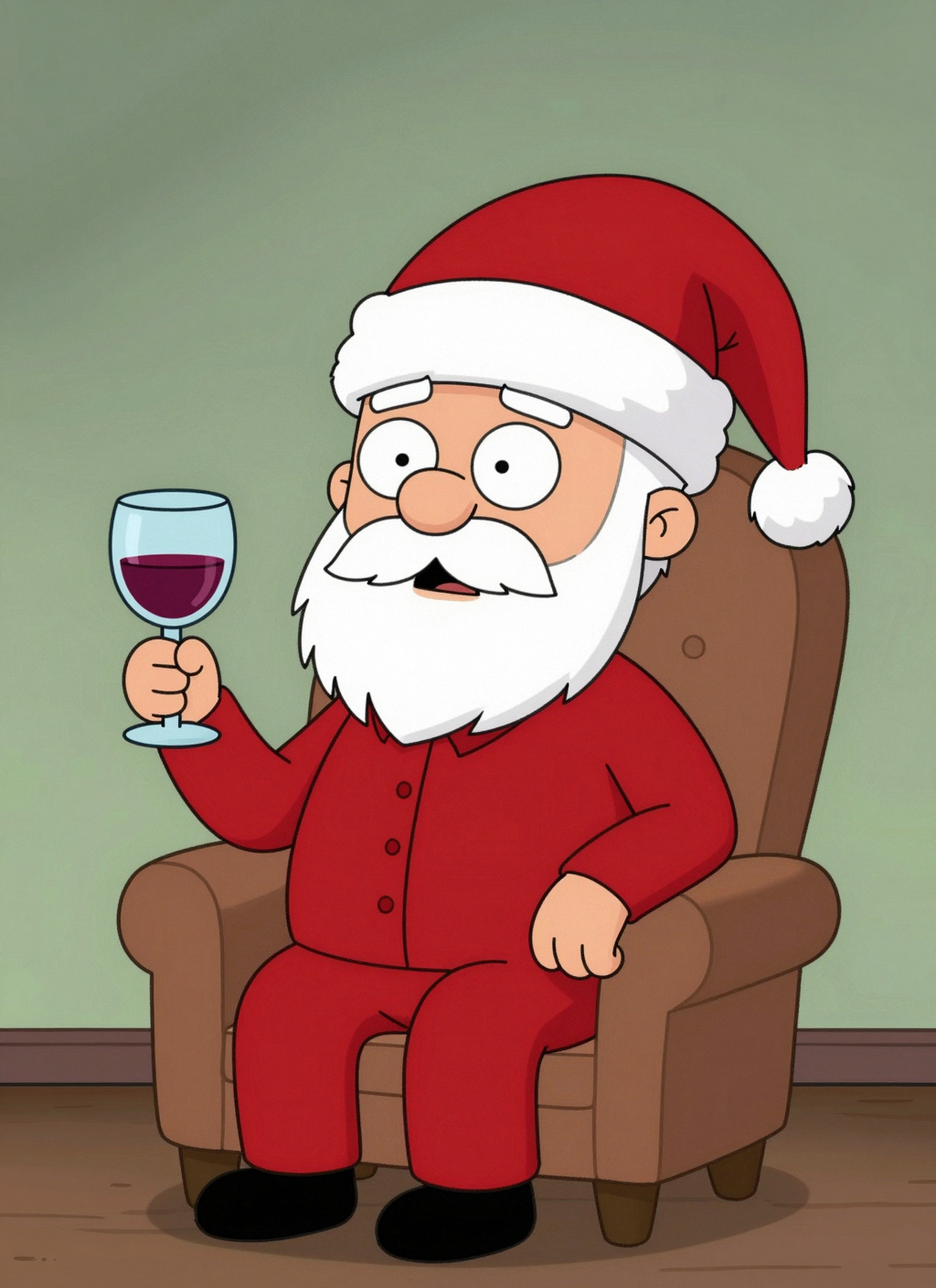 A clean, high-quality 2D cartoon illustration in the style of a modern animated TV series (like Gravity Falls or The Loud House). colors are flat but vibrant with minimal soft shading applied primarily to the characters. saturd4ym0rning A cartoon drawing of an elderly man with a white beard and mustache, wearing a red Santa hat and red pajamas, sitting in a brown armchair. He holds a glass of red wine in his right hand. The background is a simple, muted green and brown gradient. Thin lines, with minimal shading. The man has a surprised or puzzled expression on his face.
