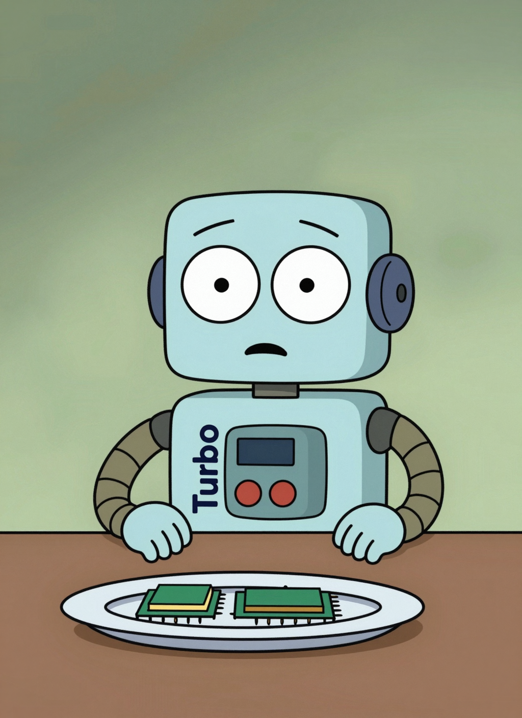 A clean, high-quality 2D cartoon illustration in the style of a modern animated TV series (similar in style to Gravity Falls or The Loud House). colors are flat but vibrant with minimal soft shading applied primarily to the characters. saturd4ym0rning A cartoon drawing a retro robot with buttons control panel on his chest, the text "Turbo" printed vertically along the left side of the chest area, his hands up on a table peering over at a a plate of computer CPUS and diodes. The background is a simple, muted green and brown gradient. Thin lines, with minimal shading. surprised or puzzled expression on his face. He has segmented tube arms coil, antenna ears