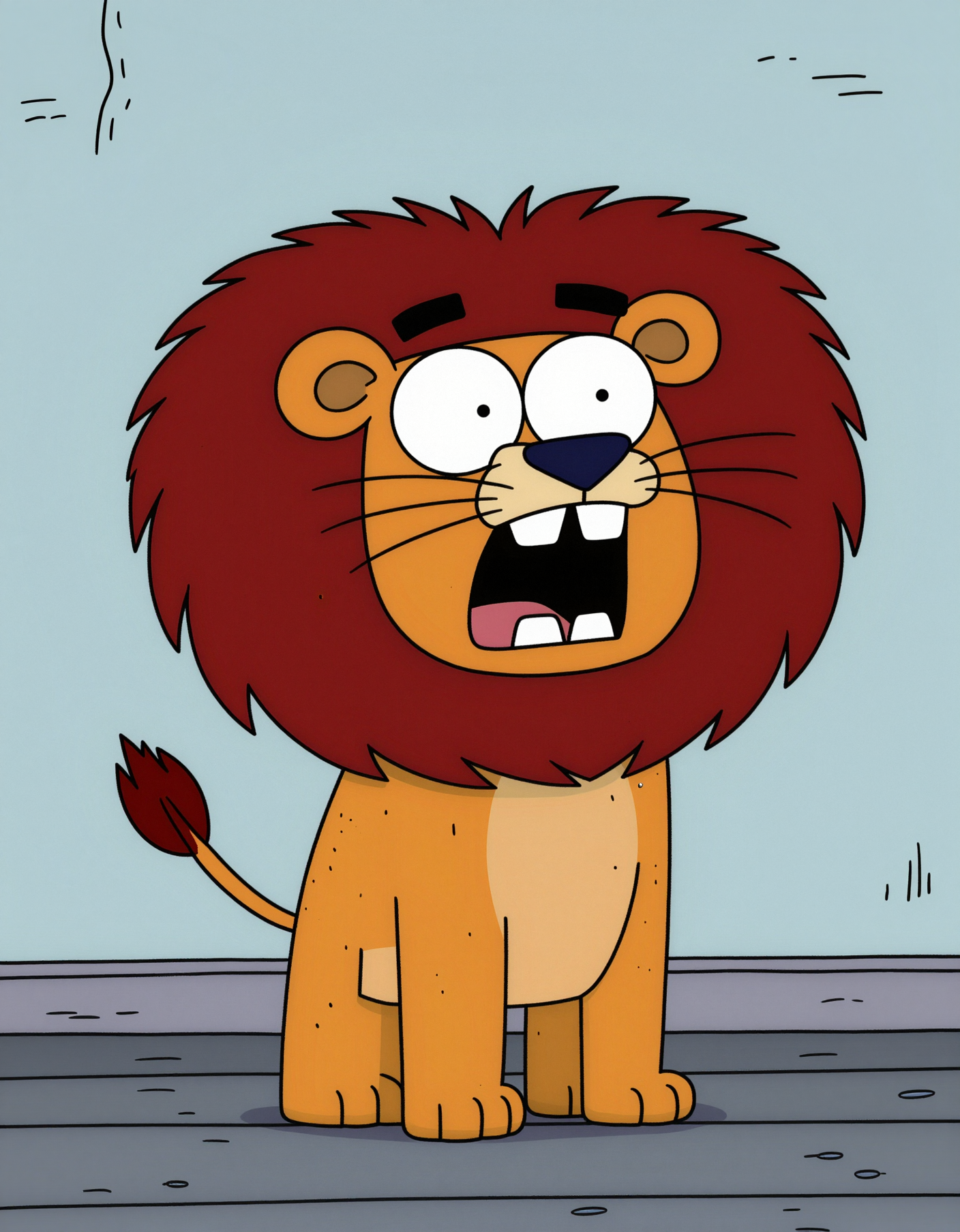 saturd4ym0rning This image is a digital cartoon drawing featuring a lion with exaggerated, comically large eyes and an open mouth, as if roaring. The lion has a bright orange body, a large, bushy red mane, and a tufted tail. It stands on a gray floor with a plain, light blue wall in the background. The lion's expression is playful and humorous, with wide eyes and an open mouth showing teeth. The drawing style is simplistic with clean lines and flat colors, typical of a children's cartoon.