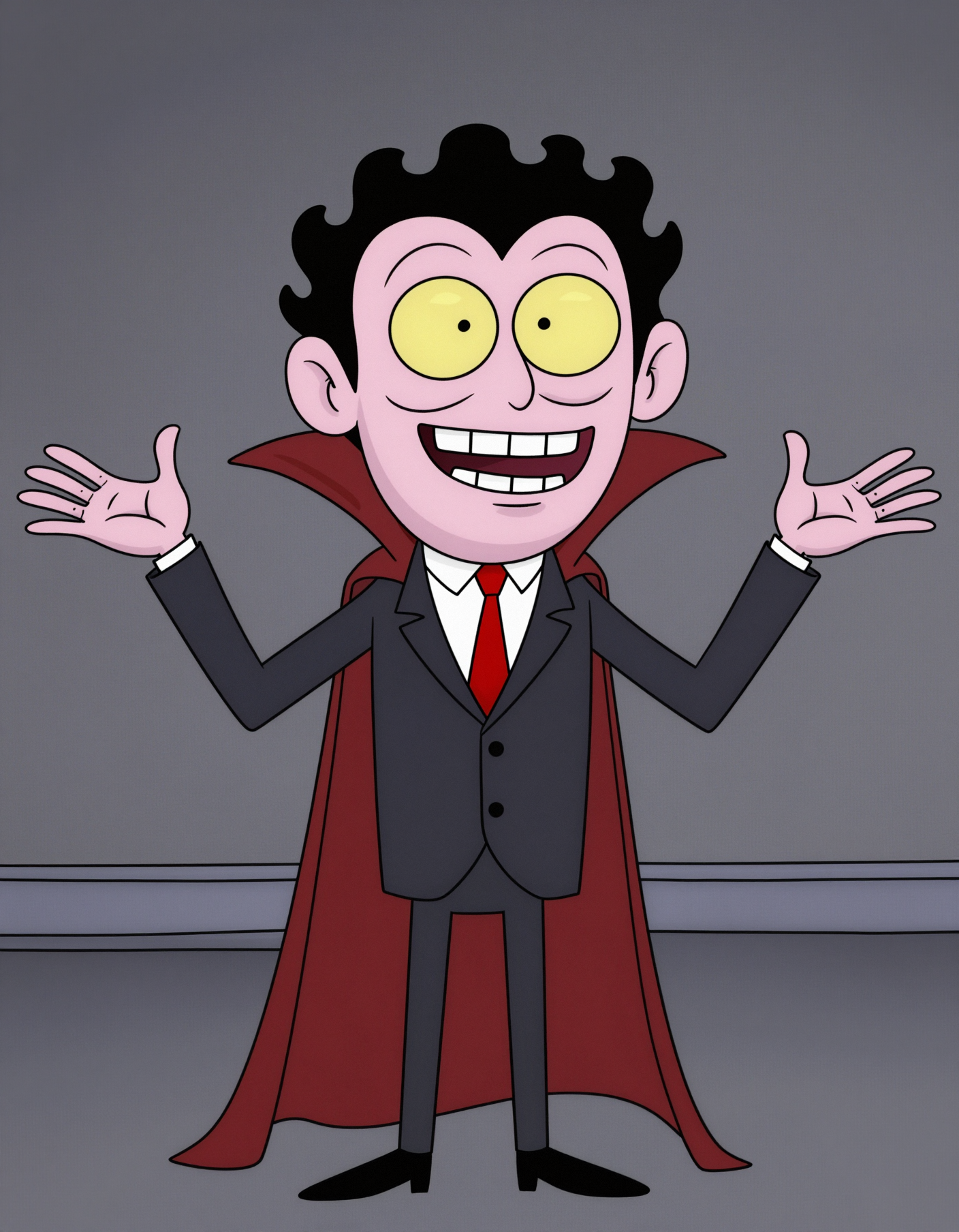 saturd4ym0rning This is a digital cartoon drawing of a classic vampire character. The vampire has exaggerated features with large, round yellow eyes and small fangs protruding from his mouth. His skin is a pale pink, and he has a black, curly hairstyle. He is wearing a dark gray suit with a white shirt and a red tie. Over his shoulders, he has a red cape. The vampire's arms are outstretched to his sides, and his hands are open, giving an impression of being welcoming or perhaps in a dramatic pose.