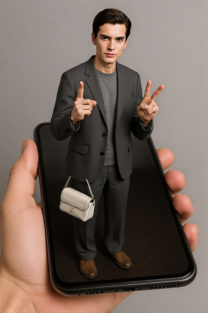 图中的人物站在被人托起的智能手机屏幕上,营造从手机中站出的三维透视错觉。采用俯视视角,双手摆出俏皮可爱的剪刀手姿势。手机屏幕呈现为深色地板般的舞台效果,通过强制透视强调手、手机与人的比例差异。手机外的背景为干净灰色,柔和室内光线,浅景深,超现实写实风格。